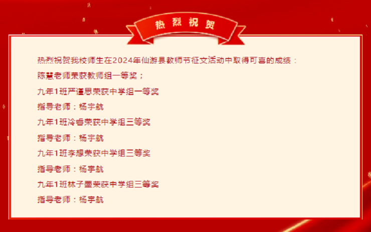 喜报:热烈祝贺我校师生在2024年仙游县教师节征文活动中取得可喜的成绩