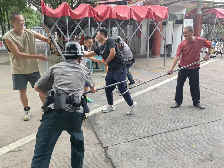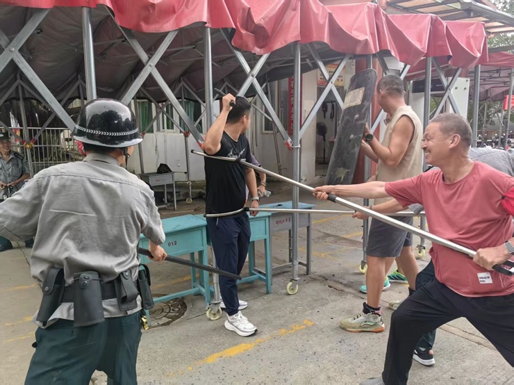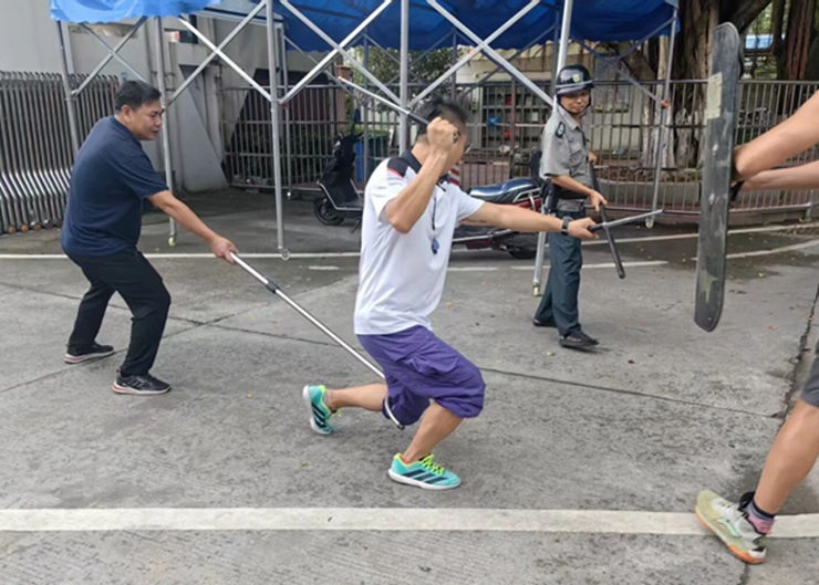 与此同时,校园应急小组成员等5人随后携带长棍、辣椒水从校园各处集结,分两路从侧后方包抄,形成合围之势。“注意保持距离!用盾牌推挤!”现场指挥员一声令下,保安与应急小组默契配合:盾牌手正面压制“暴恐分子”攻势,长棍手找准时机击落其手中凶器,钢叉手趁势锁住其脚踝将其放倒,成功制服“暴恐分子”。