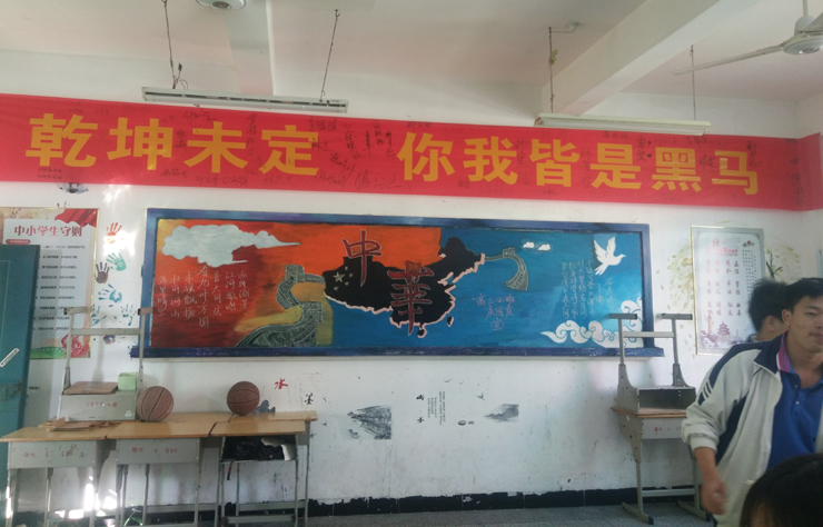 不管从北楼梯、南楼梯还是西楼梯上去,一到四层高三年教室所在的楼层,映入眼帘的就是“下定决心向前冲”、“撸起袖子加油干”、“付出总有回报”字条,振奋人心,使人斗志昂扬。各间教室励志标语既幽默诙谐又充满战斗力,还有“许愿语”也弥漫着让人心潮澎湃的味道。