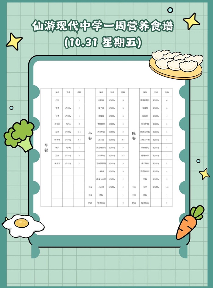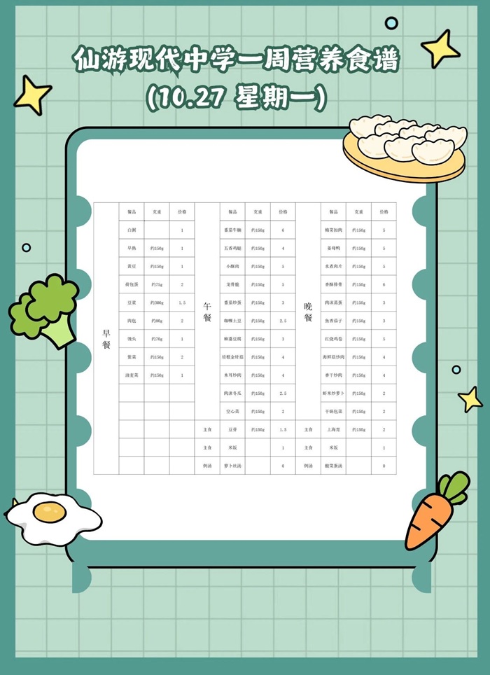 仙游现代中学2025年秋季食谱(10.27~10.31)