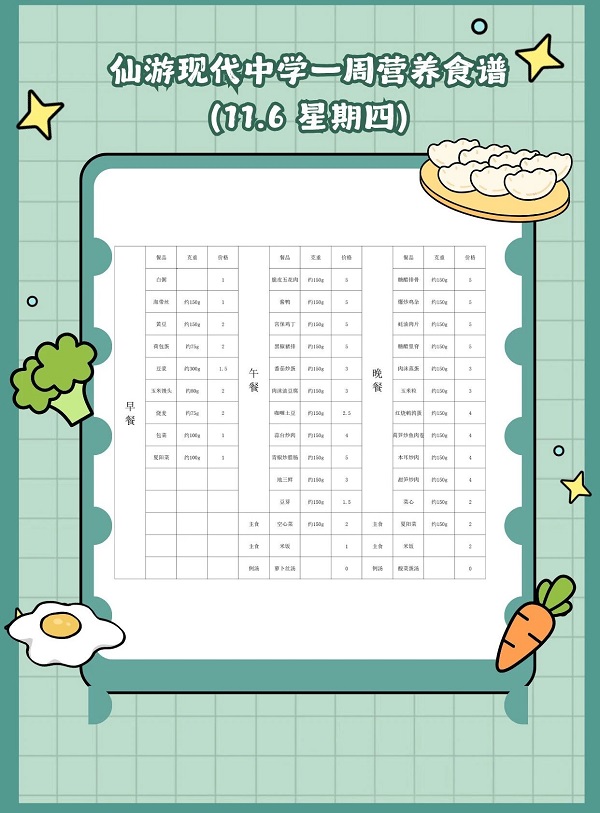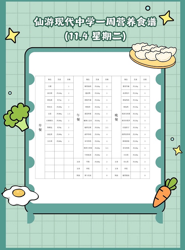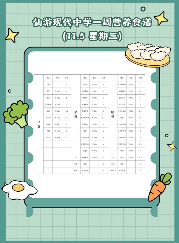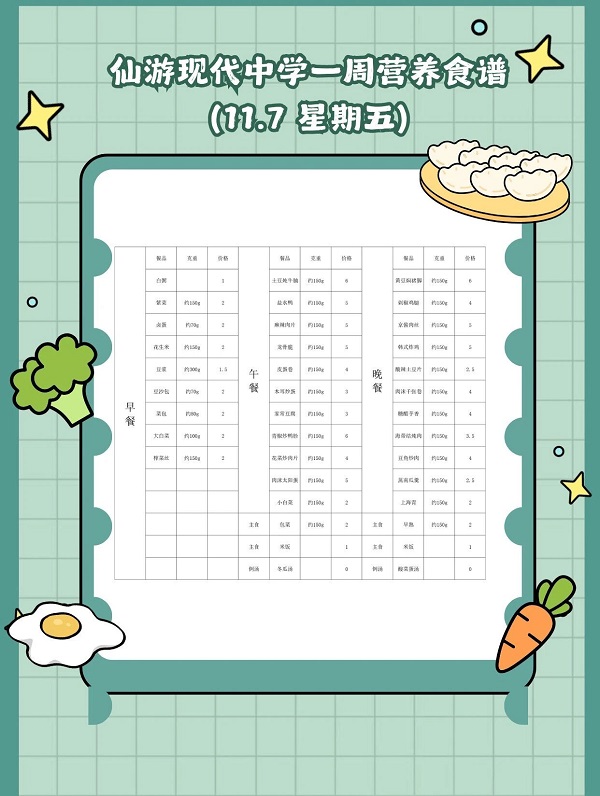 仙游现代中学2025年秋季食谱(11.03~11.07)