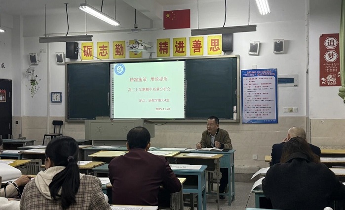 为精准研判期中考学情,明确后续教学发力方向,切实提升高三复习备考的针对性与实效性,1120日,高三年段以“提质增效”为核心主题,在新教学楼304召开期中考质量分析会。会议由年级黄主任牵头组织,高三年全体教师参会,围绕考试数据、学科问题、整改措施及备考规划展开深度研讨,为冲刺高考凝聚共识、汇聚力量。