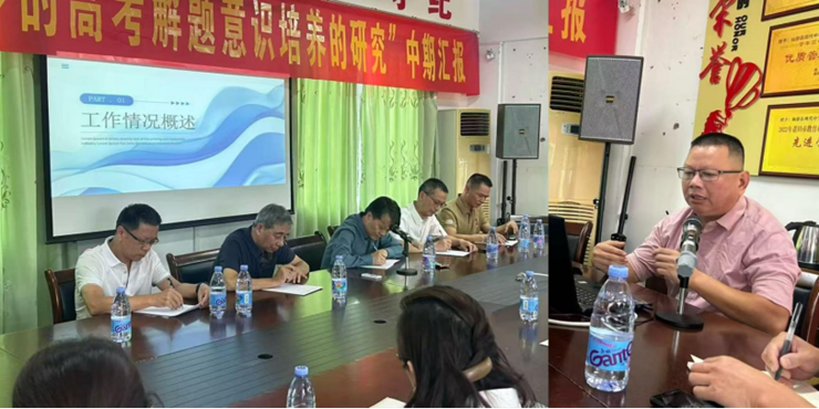 汇报会上,课题主持人刘开明老师代表课题组作中期汇报。从工作情况概述、工作成果展示、存在问题反思、后期工作计划四个方面,刘开明老师从课题研究中的准备工作、研究的思路进行详细的阐述,并展示了前期研究成果,如:解题意识的细化,解题研究的成果、命题的成果以及落地教学示范,总结和反思了在课题研究过程中产生的一些困惑和问题,如概念的界定是否清晰、意识的细分是否准确,并对下一阶段的课题研究工作提出了对应计划。