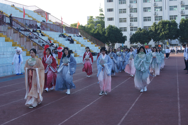 运动会的开幕式上还有精彩的入场式表演。六个年段的精心筹划和准备,集中展示了每一个集体的智慧。青春的脚步,快如金秋之风;绽放的笑容,灿若春晓之花。同学们精彩的文艺汇演为开幕式增添了不少光彩。