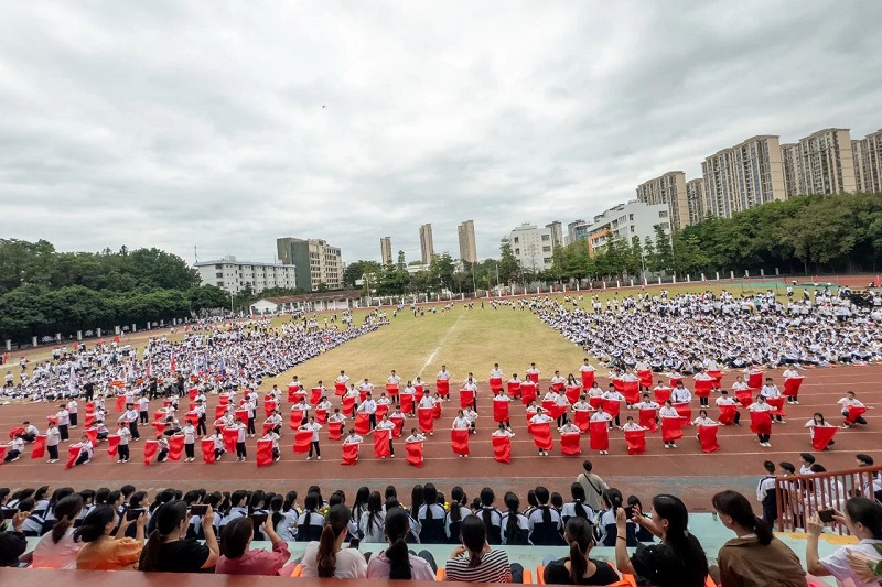 在开幕式的舞台上,文艺表演更是精彩纷呈,宛如一场视觉与听觉的奢华盛宴。高三年的舞蹈《与凤行》,舞者们似凤凰展翅,轻盈的舞步中展现出奇幻仙侠的韵味,仿佛将观众带入了一个仙侠世界,领略其中的浪漫与豪情; 高一年的彩带舞《相亲相爱》,彩带随风舞动,如同缤纷的彩带编织出温馨有爱的画卷,传递着团结与欢乐,恰似爱的旋律在空气中流淌;