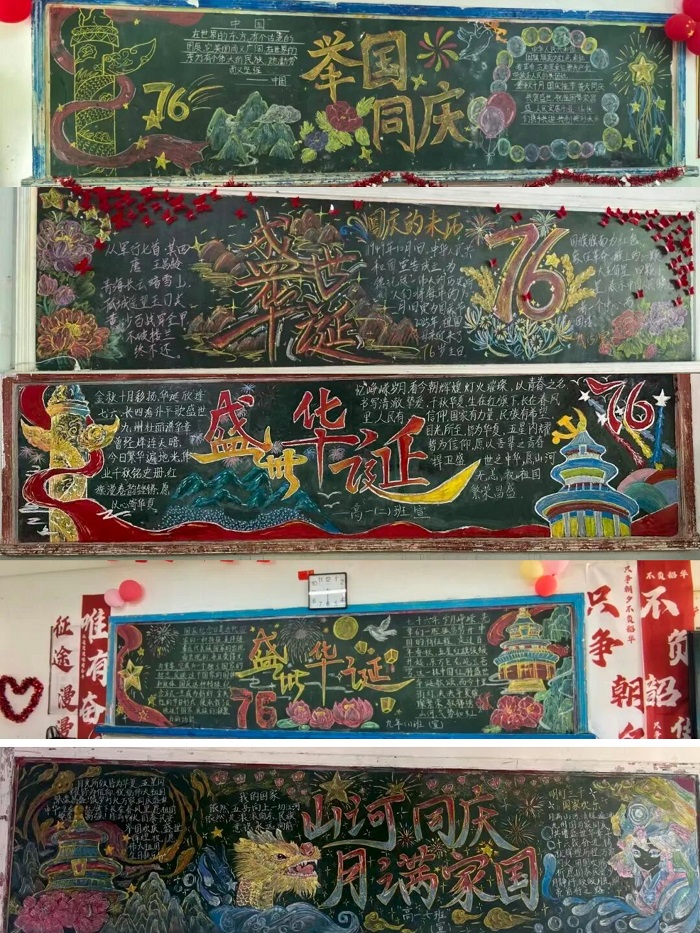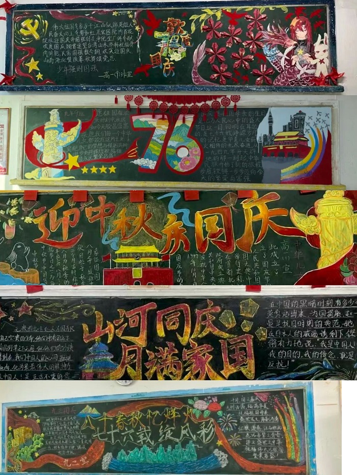 活动自启动以来,各班级积极响应、精心筹备。在黑板报创作中,同学们以“国庆”为核心,将家国情怀融入笔墨丹青,每一笔都饱含对祖国的深情祝福;卫生评比中,各班师生齐心协力,打造出窗明几净、整洁有序的学习环境;教室布置则彰显个性与创意,同学们巧用国旗、灯笼、剪纸等元素点缀空间,让教室成为传递正能量的“精神阵地”。