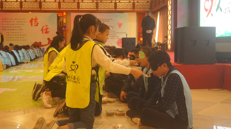 在两人面对面对话环节中,同学们与成功企业家、资深教练、陌生的家长、同学直接对话,倾诉自己学习、生活中的压力和压抑,畅聊生命理想和人生价值。在中午的爱心便餐中,学生给各自蒙眼的家长喂食简易的爱心午餐,感动了无数家长,也进一步领会到家长平日的不容易。