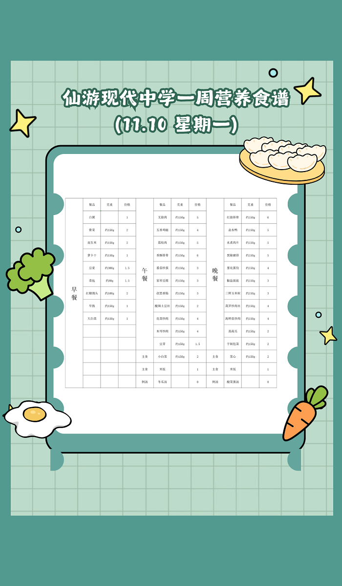 仙游现代中学2025年秋季食谱(11.10~11.14)