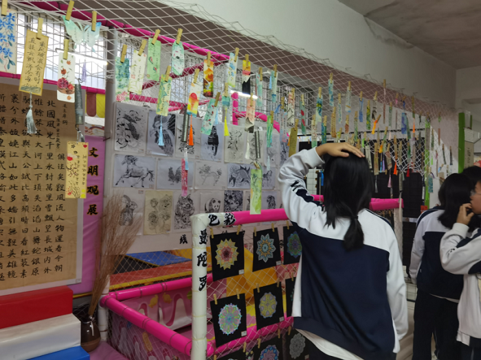 中国书画区笔墨丹青间传承文化底蕴书法作品字迹工整,绘画作品意境悠远 福籽同心爱中华区主题鲜明的艺术作品表达对祖国的热爱与祝福,情感真挚浓厚 风筝会说话区五彩斑斓的风筝承载着梦想与故事悬挂在空中,仿佛在诉说着美好的愿景 国风书签区精致的书签融入国风元素既是实用的文具,也是独具特色的艺术品 漫步在这艺术的天地间,看同学们或驻足细品、或提笔记录,艺术的种子已在悄然生长。这场校园艺术展,不仅是一场视觉的盛宴,更是一次文化的浸润、创意的狂欢。