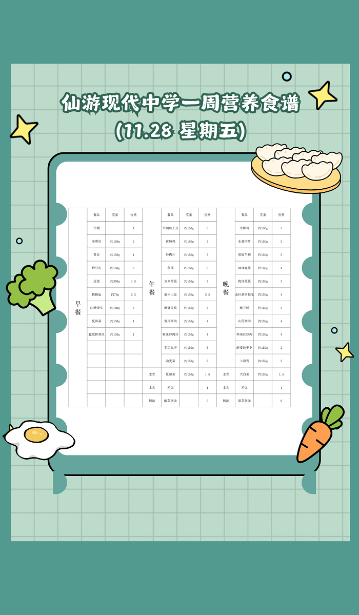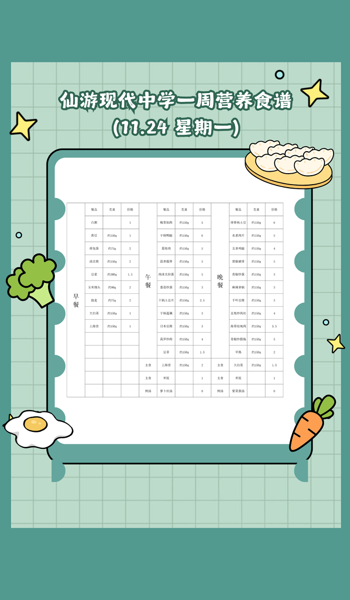 仙游现代中学2025年秋季食谱(11.24~11.28)
