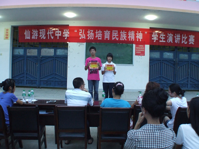 仙游现代中学“弘扬培育民族精神” 学生演讲比赛获奖名单 一等奖 八年(14)班 吴晗曦 八年(8)班 肖佩云 二等奖 八年(11)班 张之山 八年(4)班 黄燕燕 八年(12)班 叶益霖 八年(5)班 范慧宇 八年(1)班 吴怡杭 三等奖 八年(13)班 庄心怡 八年(7)班 林晓颖 八年(10)班 郑 倩 八年(3)班 林 慧 八年(2)班 陈 煜 八年(6)班 李嘉豪 八年(15)班 林 霁 八年(9)班 张成桑 仙游现代中学团委会 2010.9.28