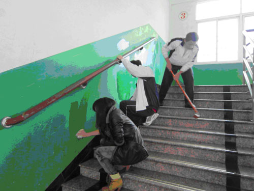 为了使校园环境保持美好洁净,保障教学工作和师生生活有一个舒适宜人的环境。我校团委于2012年2月17日组织高一部分学生对教学楼的三面楼梯进行了卫生大扫除。清洁范围包括楼梯扶手、墙壁、窗户以及男女厕所之间的走道,在高一学生的团结合作与任劳任怨的基础上,经过一个多小时的努力,使教学楼的环境焕然一新。