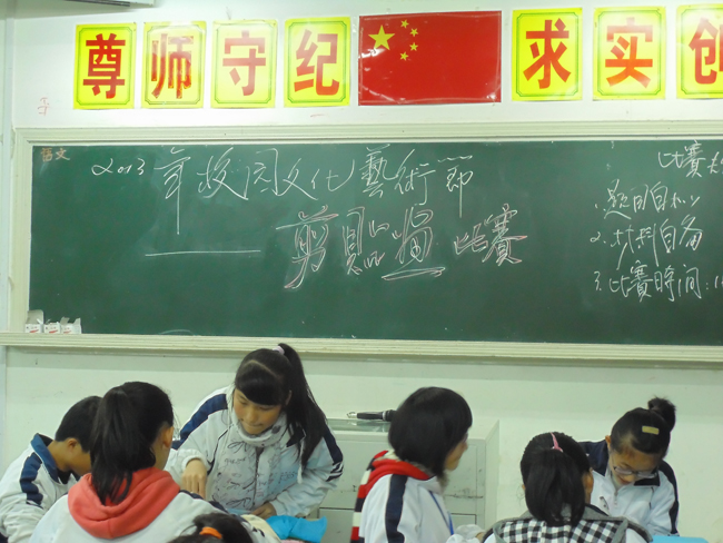2013年11月17日下午第三节,我校政教处组织了校园文化艺术节活动系列之七、八年级剪贴画的比赛。此次剪贴画比赛以小组形式参赛,每小组3人,题目自拟。此次活动的开展,陶冶了学生的情操和审美情趣,丰富了学生的课外生活。