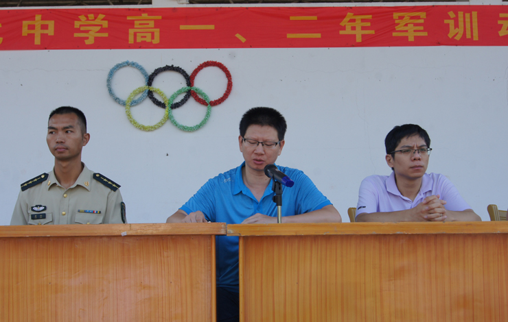 96782部队周松连长及相关教官、我校傅秀珍副校长、杨育容主任、高一年段长张益萍、高二年段长许世敬、高一、高二年段全体师生出席动员大会。全体高一、二年级学生将进行为期七天的军训活动。