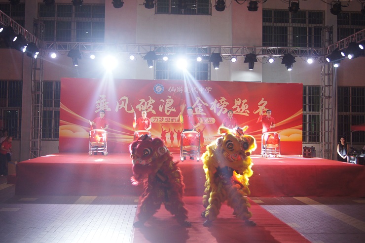 校领导王明忠、傅秀珍、史成琳、黄江闽和高三年主任李剑凡共同击鼓助威,瞬间将活动推向高潮。舞狮灵动活泼,上下翻飞,鼓声铿锵有力,响彻校园。 校长寄语,温暖前行 开场表演结束后,王校长健步上台。